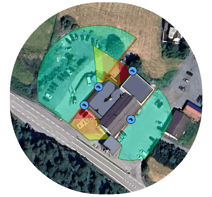 - Oversikt over kameraer – Plassering, dekningsområder og kabellengder.